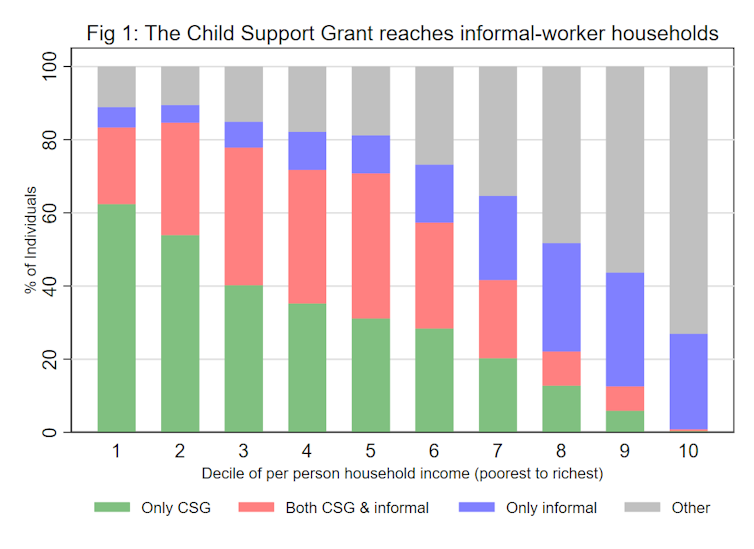 The figure shows that in the poorest half of the population, the child support grant reaches 80% of individuals who are in informal worker households (the red bars are much bigger than the blue bars).