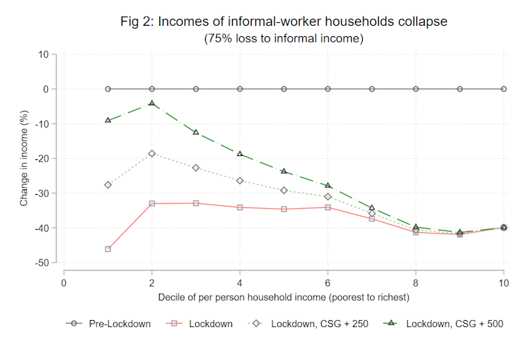The graphic below (Figure 2) shows the percentage changes in shared household incomes under various scenarios, but only for individuals who are in households that contain an informal worker. The red line shows the loss in income compared with the pre-lockdown scenario (black line). As can be seen from the figure, for the bottom six deciles we project about a 33% loss in per-person household incomes as informal incomes collapse.