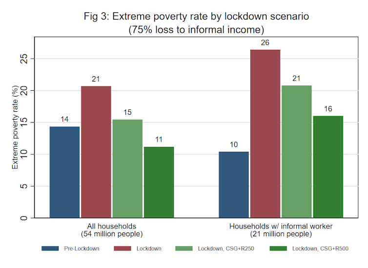 A top-up of R500 per month would reduce the national extreme poverty rate compared to pre-lockdown levels, while for those in informal-worker households the extreme poverty rate increases by just six percentage points, rather than 16 percentage points. A top-up of R250 per month, while certainly an improvement over the status quo, is not nearly as effective for informal-worker households.
