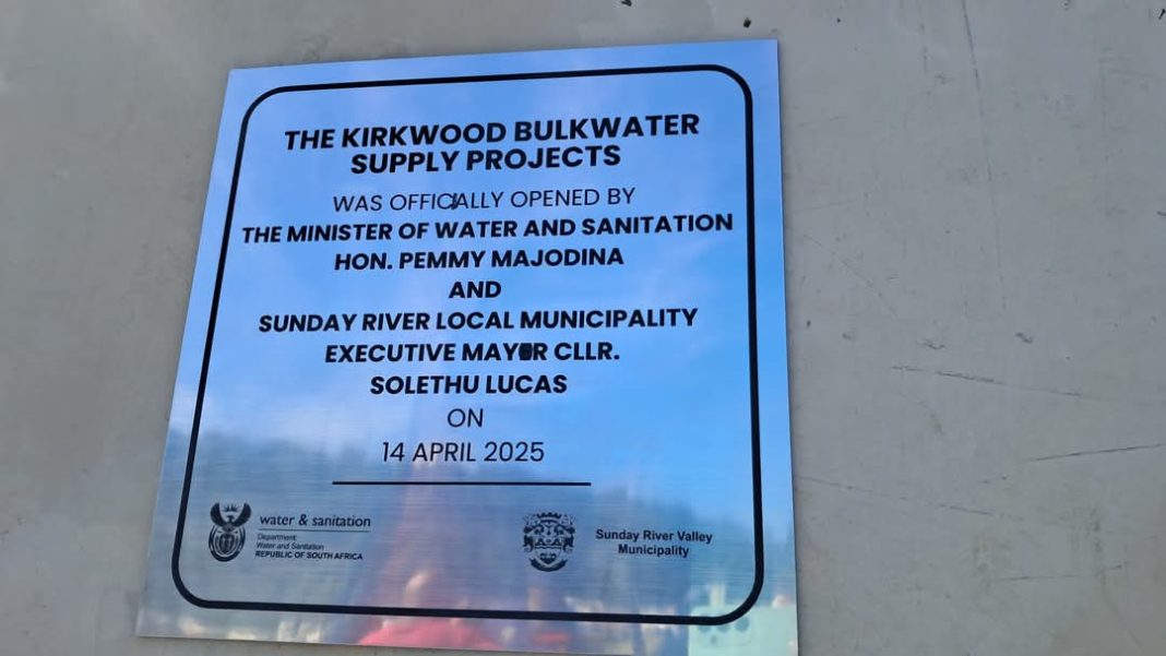 Water and Sanitation minister Pemmy Majodina has handed over the completed Kirkwood Bulk Water project, delivering water security to the Kirkwood community through the R35 million infrastructure project.