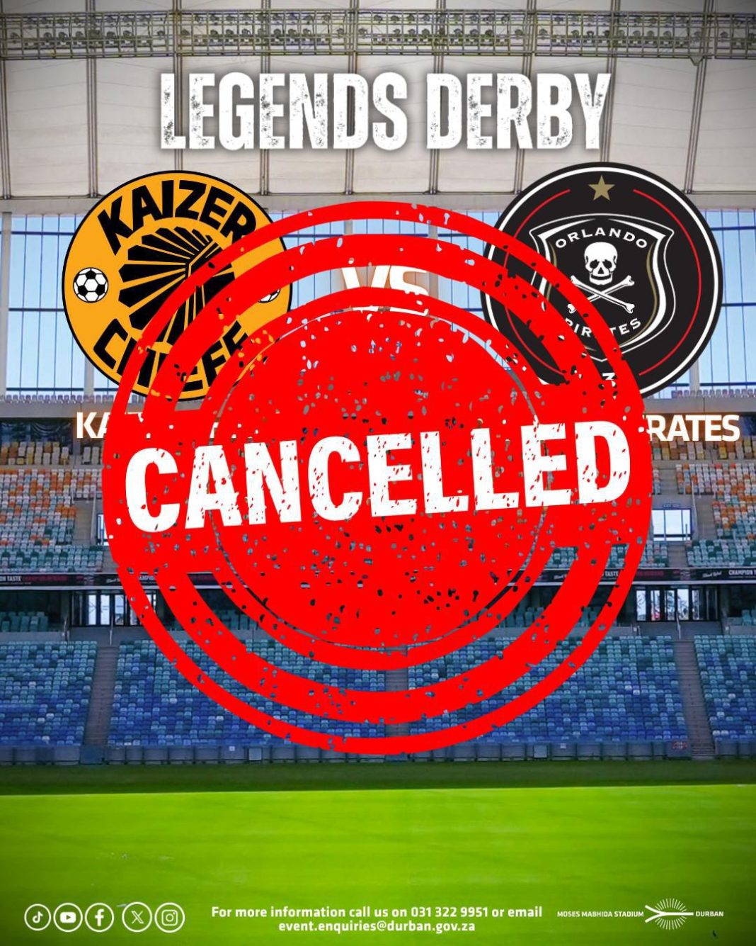 The Legends Derby between Kaizer Chiefs and Orlando Pirates, scheduled for Sunday at Moses Mabhida Stadium, has been cancelled, with organisers citing circumstances beyond their control.