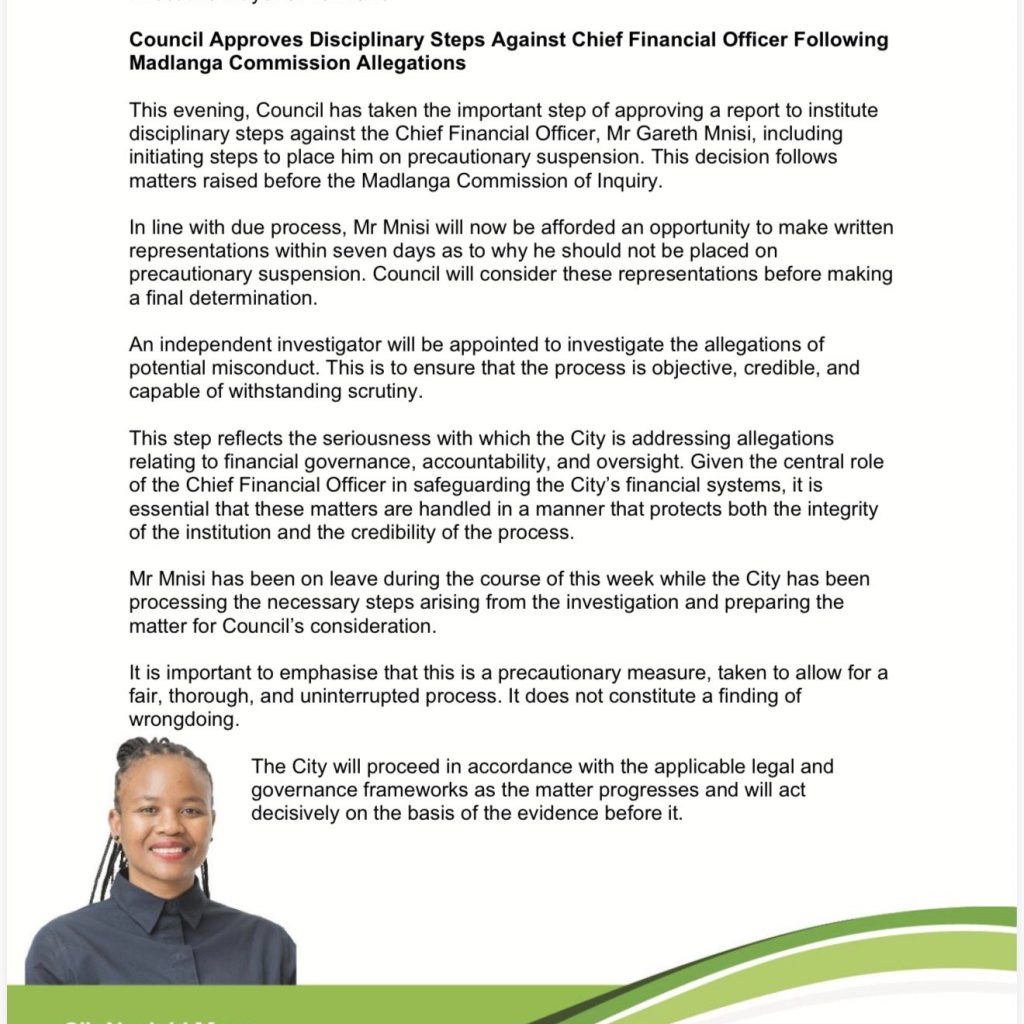 The City of Tshwane Council has suspended Chief Financial Officer Gareth Mnisi for three months, pending a formal investigation into allegations of tender manipulation.